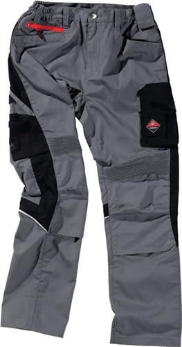 Obermaterial: 65 % Polyester / 35 % Baumwolle · Kontrastmaterial: 100 % Polyester · zweifarbige Bundhose mit moderner Taschenführung · Kniebesatz in Technik-Oxford · Seitenbundverarbeitung und Kniebereich gestretcht · Handy- und Zollstocktasche