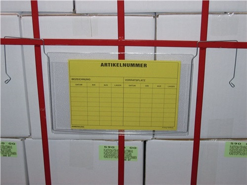 zum Schutz von Begleitpapieren · für Gitterboxen, Aufsatzrahmen, Lager- und Transportbehälter usw. · mit eingeschweißtem Bügel zum Anhängen · VE = 100 Stück