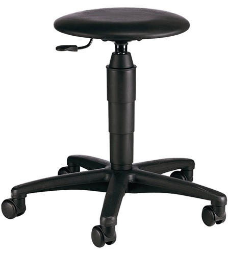 Sitz mit bequemem Kunstlederpolster Ø 360 mm · stabiles, kippsicheres Fünffuß-Kunststoff-Fußkreuz, Farbe schwarz · Sitzhöhenverstellung mit Sicherheitsgasfeder · Untergestell mit lastabhängig gebremsten Sicherheits-Doppelrollen
