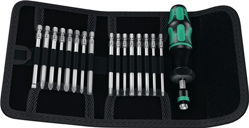 mit variabler Drehmomenteinstellung und Wechselklingen (89 mm lang) Inhalt: 1 einstellbarer Kraftform Drehmomentgriff mit Schnellwechselfutter Rapidaptor) je 1 Wechselklinge für Schrauben mit Kreuzschlitz (PH) Gr. 1 - 2 und 3* je 1 Wechselklinge für Schrauben mit Kreuzschlitz (PZD) Gr. 1 - 2 und 3* je 1 Wechselklinge für Schrauben mit Innen-TORX®-Profil auch mit Sicherungsstift Gr. T 10 - T 15 - T 20 - T 25 - T 30* je 1 Wechselklinge für Schlitzschrauben 1,0 x 5,5 mm* je 1 Wechselklinge mit Hex-Plus Profil für Schrauben mit Innensechskant-Profil Gr. 3, 4, 5, 6 mm* *alle Wechselklingen 89 mm lang · Weitere technische Eigenschaften Inhalt: 17-teilig • Griff: Kraftform Kompakt • Verpackung: Falttasche