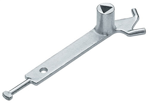 gefertigt nach DIN 3223 · aus Stahlguss · der vordere Haken ist zum Öffnen von Sicherheitsverschlüssen an Pfosten, das T-Stück am Ende für die Entriegelung von Abdeckkappen