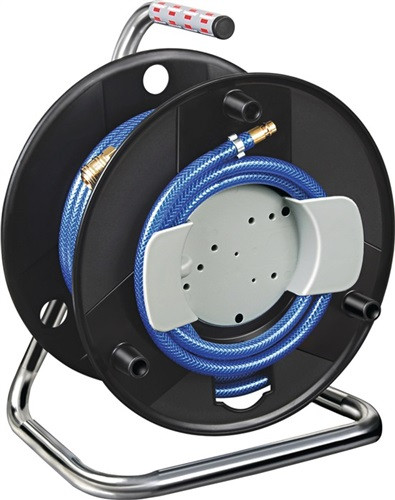 Druckluftschlauchtrommel Standard · mit hochwertigem Gewebeschlauch · mit Metall-Einhand-Schnellkupplungen · Trommelkörper aus hochbruchfestem Spezialkunststoff · Gestell aus verzinktem Stahlrohr · Armatur: DIN · Weitere technische Eigenschaften Farbe: transparent