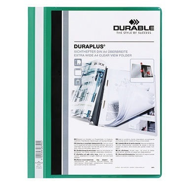 Beschriftungsstreifen über die gesamte Höhe. Innentasche im Rückdeckel, überbreiter Schnellhefter, für Prospekthüllen geeignet, mit Schnellhefter-Mechanik und Hängeschienen-Einschubkanal, Ergänzung mit Abheftschieber und Abdeckschiene möglich. · Material der Heftmechanik: Metall, kunststoffummantelt · Verwendung für Papierformat: DIN A4, Überbreite · Werkstoff: PVC · transparenter Vorderdeckel vorhanden: Ja · Sichttasche auf dem Vorderdeckel vorhanden: Ja · max. Anzahl der Blätter: 100 Bl (80 g/m²) · Farbe: grün · Einstecktasche vorhanden: Ja · beweglicher Heftfalz vorhanden: Nein · Beschriftungsfeld vorhanden: Ja · Abheftvorrichtung vorhanden: Ja · Ausführung der Lieferzusammenstellung: Inkl. Einschubkanal für Hängeschiene · Maße: 24,5 x 31 cm (B x H)