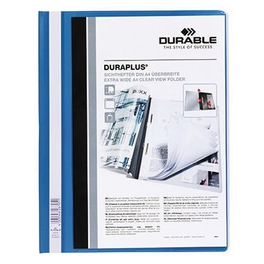Beschriftungsstreifen über die gesamte Höhe. Innentasche im Rückdeckel, überbreiter Schnellhefter, für Prospekthüllen geeignet, mit Schnellhefter-Mechanik und Hängeschienen-Einschubkanal, Ergänzung mit Abheftschieber und Abdeckschiene möglich. · Material der Heftmechanik: Metall, kunststoffummantelt · Werkstoff: PVC · Verwendung für Papierformat: DIN A4, Überbreite · transparenter Vorderdeckel vorhanden: Ja · Sichttasche auf dem Vorderdeckel vorhanden: Ja · max. Anzahl der Blätter: 100 Bl (80 g/m²) · Maße: 24,5 x 31 cm (B x H) · Farbe: blau · Einstecktasche vorhanden: Ja · beweglicher Heftfalz vorhanden: Nein · Beschriftungsfeld vorhanden: Ja · Abheftvorrichtung vorhanden: Ja · Ausführung der Lieferzusammenstellung: Inkl. Einschubkanal für Hängeschiene
