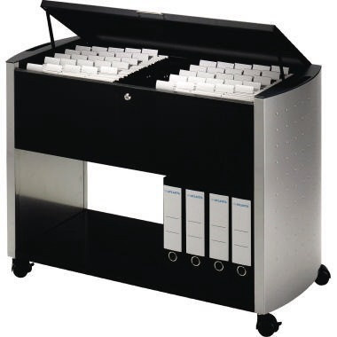 Mit Deckel und geschlossenem Wannenboden. Mit zusätzlichem Ablageboden. Gebogene Design Seitenteile mit dekorativem Perforationseffekt. · Maße: 98,5 x 69,5 x 44 cm (B x H x T) · max. Anzahl der Hängemappen: 100 Hängemappen · max. Aufbewahrungsmenge: 100 Hängemappen · Montageart bei Lieferung: zerlegt · Produktverwendung: Hängemappen DIN A4 · Rollen vorhanden: Ja · Tiefe: 440 mm · Griff vorhanden: Ja · Werkstoff: Stahl, epoxidharzbeschichtet · Schloss vorhanden: Ja · Ablage vorhanden: Ja · Farbe: anthrazit/silber metallic · Deckelverriegelung vorhanden: Ja · Breite: 985 mm · Ausführung des Bodens: geschlossen · Ausführung der Lieferzusammenstellung: inkl. Montageanleitung · Anzahl der Bahnen: 2-bahnig · Höhe: 695 mm · Lenkrolle feststellbar: Ja