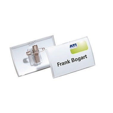 Namensschild aufklappbar, flexibles Filmscharnier hält die Vorder- und Rückseite des Schildes zusammen und ermöglicht ein einfaches und schnelles Austauschen des Einsteckschildes. · Beschreibung der Besonderheiten: aufklappbar, flexibles Filmscharnier hält die Vorder- und Rü · Werkstoff: Polypropylen · Verwendung für Papiergrößen: 75 x 40 mm (B x H) · Packungsmenge: 25 St./Pack. · Befestigungstechnik: Kombiklemme · Beschriftungsschild auswechselbar: Ja · Farbe: transparent