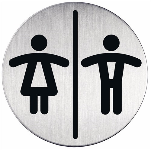 Für verschiedenste Oberflächen. · Befestigungstechnik: Selbstklebepad · Durchmesser: 83 mm · Farbe: silber metallic · Typbezeichnung des Motivs: WC Damen/Herren · Werkstoff: Edelstahl, gebürstet