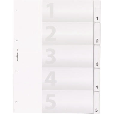 Glasklare umschweißte Taben. Auswechselbare Einsteckschilder, numerisch, blanko und blanko mit Farbstreifen, liegen bei. Beschriftbar mit DURAPRINT®-Beschriftungssoftware. · Deckblatt vorhanden: Ja · Werkstoff: Hartfolie · Verwendung für Papierformat: DIN A4 · Farbe: transparent · Maße: 21/22,5 x 29,7 cm (B x H) · Stärke: 0,13 mm · Ausführung des Registers: volle Höhe · Ausführung der Tabe: blanko · Ausführung der Lochung: 4fach Lochung · Anzahl der Registerblätter: 5 Registerblätter · Beschriftungsschild auswechselbar: Ja