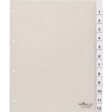 Zum Unterteilen von Schriftgut in Prospekthüllen. Glasklare, umschweißte Tabe. Auswechselbare Einsteckschilder liegen bei. Beschriftbar mit DURAPRINT®-Beschriftungssoftware. · Beschriftungsschild auswechselbar: Ja · Werkstoff: Hartfolie · Verwendung für Papierformat: DIN A4, Überbreite · Stärke: 0,13 mm · Maße: 23/24,5 x 29,7 cm (B x H) · Farbe: transparent · Ausführung des Registers: volle Höhe · Ausführung der Tabe: 01. Dez · Ausführung der Lochung: 4fach Lochung · Anzahl der Registerblätter: 12 Registerblätter · Lochrandverstärkung vorhanden: Nein