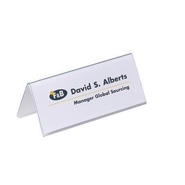 Für Seminare, Rezeption und Schalter mit auswechselbarem Blanko-Einsteckschild mit Dekorrahmen. · Werkstoff: Hartfolie · beidseitig verwendbar: Ja · Beschriftungsschild auswechselbar: Ja · Farbe: transparent · Packungsmenge: 25 St./Pack. · Sonderform: Dachform · Verwendung für Papiergrößen: 150 x 61/122 mm (B x H)