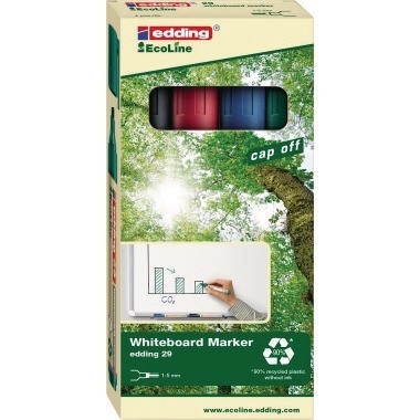 Zum Schreiben und Markieren auf Whiteboards. Trocken abwischbar von fast allen geschlossenen Oberflächen wie Emaille, Glas, Melamin. Kunststoffteile bestehen insgesamt zu mindestens 90 % aus recyceltem Material (83 % post-consumer). · Spitze austauschbar: Ja · Strichstärke: 01. Mai mm · Schreibfarbe: rot, blau, grün, schwarz · schnelltrocknend: Ja · nachfüllbar: Ja · Material des Schaftes: Kunststoff · Kappe umsteckbar: Ja · Farbe des Schaftes: weiß · Druckmechanik vorhanden: Nein · Clip vorhanden: Ja · Bezeichnung der Schreibflüssigkeit: geruchsarme Tinte, butylacetatfrei · Ausführung des Inhalts mit Packung: 4 St./Pack. · Ausführung der Spitze: Keilspitze · Ausführung der Farbe: farbig sortiert · kann einige Tage offen liegen bleiben ohne einzutrocknen: Ja