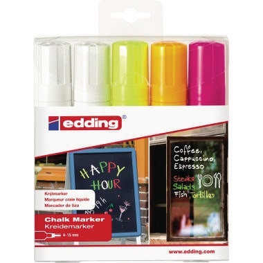 zum Gestalten, Verzieren und Beschriften von z.B. Fenstern, dunklen Tafeln, Glas und Spiegeln. Ist von fast allen geschlossenen Oberflächen feucht abwischbar. · Kappe umsteckbar: Ja · lichtbeständig gegeben: Nein · wasserfest: Nein · Strichstärke: Apr 15 mm · Spitze austauschbar: Nein · Schreibfarbe: 2 x weiß, je 1 x neongelb, neonorange, neonpink · nachfüllbar: Nein · wischfest: Nein · Ausführung der Farbe: farbig sortiert · Material des Schaftes: Kunststoff · abwischbar: Ja · Ausführung der Spitze: Blockspitze · Ausführung des Inhalts (Packung): 5 St./Pack. · Bezeichnung der Schreibflüssigkeit: Flüssigkreide auf Wasserbasis · Clip vorhanden: Nein · Farbe des Schaftes: weiß