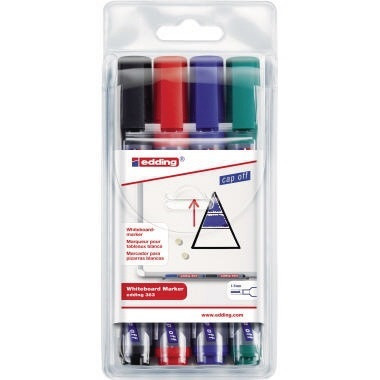 Zum Schreiben und Markieren auf Whiteboards. Trocken abwischbar von fast allen geschlossenen Oberflächen, wie Emaille, Glas, Melamin. · Farbe des Schaftes: grau · Material des Schaftes: Kunststoff · Strichstärke: 01. Mai mm · Spitze austauschbar: Ja · Schreibfarbe: rot, blau, grün, schwarz · schnelltrocknend: Ja · nachfüllbar: Ja · Ausführung der Farbe: farbig sortiert · kann einige Tage offen liegen bleiben ohne einzutrocknen: Ja · Druckmechanik vorhanden: Nein · Clip vorhanden: Ja · Bezeichnung der Schreibflüssigkeit: geruchsarme Tinte auf Alkoholbasis · Ausführung des Inhalts mit Packung: 4 St./Pack. · Ausführung der Spitze: Keilspitze · Kappe umsteckbar: Ja