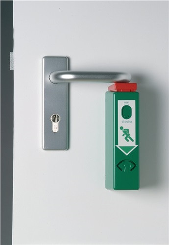 Einhandbedienung · DIN EN 179 · zur Überwachung von Fluchttüren in Rettungswegen · Profil-Halbzylinder inkl. 2 Schlüssel · lauter Alarmton 95 dB/1 m · aus Metall (Zinkdruckguss)· grün lackiert (RAL 6029) · 9 V Batterie · 2 Schlüssel · 1 kleines Piktogramm für den Türwächter mit Richtungspfeil, langnachleuchtend · 1 großes Piktogramm für die Tür, langnachleuchtend · mit Befestigungsschrauben · 5 Jahre Herstellergarantie · Art.-Nr. 3000250538 (Typ 990 100) mit zusätzlichem Voralarm beim Antippen · Weitere technische Eigenschaften Farbe: grün lackiert • Norm: DIN EN 179