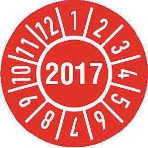 selbstklebende Folie · ideal für die Kennzeichnung aller kurz-und mittelfristigen Wartungsintervalle · leichte Erkennbarkeit des Prüftermins · VE = 100 Stück im Beutel · Weitere technische Eigenschaften Ausführung: Jahr 2017 mit Monaten • Ø: 30mm • Gebinde: Beutel