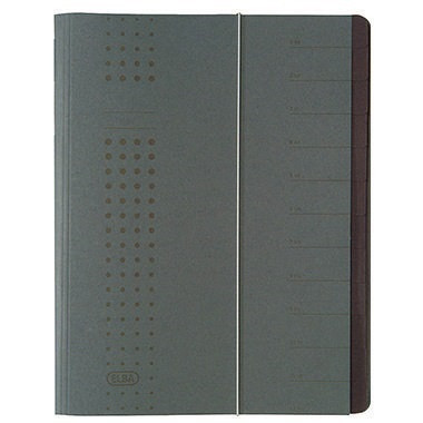 Vorderdeckel mit Tabaufdruck und Feineinteilungen zum Beschriften. · Grammatur: 450 g/m² · Greifausschnitt vorhanden: Nein · Höhe: 315 mm · Maße: 25 x 31,5 cm (B x H) · Material des Einbandes: Karton · Sichttasche auf dem Vorderdeckel vorhanden: Nein · Breite: 250 mm · Prägung vorhanden: Nein · Einstecktasche vorhanden: Nein · Beschriftungsfeld vorhanden: Ja · Ausführung der Tabe: blanko · Art des Verschlusses: Gummizugverschluss · Anzahl der Fächer: 12 Fächer · 3 Klappen (Jurisklappen) am Unterdeckel vorhanden: Nein · Verwendung für Papierformat: DIN A4 · Farbe: anthrazit