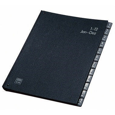 Zwischenblätter aus 320 g/m² Manilakarton mit dehnbarem Leinenrücken. Mit überstehenden Polypropylen-Taben. · Breite: 265 mm · Werkstoff: Hartpappe · Verwendung für Papierformat: DIN A4 · Material des Einbandes: Hartpappe · Maße: 27 x 34 cm (B x H) · Höhe: 340 mm · Farbe des Fächerblocks: grau · Beschriftungsschild auswechselbar: Nein · Ausführung des Inhalts (bezüglich der Hauptausstattungsteile: überstehende Polypropylen-Taben · Ausführung der Tabe: 1-12, Jan.-Dez. · Anzahl der Sichtlöcher: 3 Sichtlöcher · Anzahl der Fächer: 12 Fächer · Farbe: schwarz