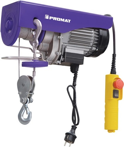 mit Umlenkrolle und Federbügel · kompakte Bauweise · einfache Handhabung · Steuerschalter mit Not-Halt-Taster · thermischer Überlastschutz · Hubendschalter für höchste und niedrigste Hakenstellung · Steuerkabellänge 2 m · Stromanschlusskabel 3 m · Netzspannung 230 V · Schutzart IP 54 · Betriebsart S3