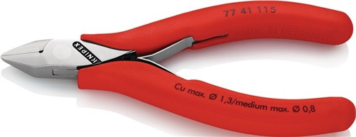 Spezial-Werkzeugstahl in Sondergüte · ölgehärtet · für feinste Arbeiten an elektronischen Bauteilen · durchgestecktes, spielfreies Gelenk · Schneiden induktiv gehärtet · Schneidenhärte ca. 62 HRC · mit Öffnungsfeder Kopf spiegelpoliert · Griffe mit Kunststoffüberzug