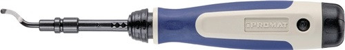 mit ergonomischen 2-Komponenten-Kunststoffgriff · mit integriertem Reservefach für Ersatzklingen · Klingenhalter (für Klingen mit 2,6 mm Schaftdurchmesser) um maximal 110 mm ausziehbar · Klinge leicht und schnell auswechselbar geeignet zum Entgraten von rostfreiem Stahl, Stahl, Aluminium, Kupfer, Messing und Kunststoff