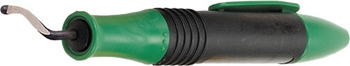 mit praktischem Taschenklipp und Klingenaufbewahrung · entgratet Stahl, Aluminium, Kupfer und Kunststoff · für gerade Kanten, Innenbearbeitung Vorderseite · Glo-Burr E: bewährtes, bequem zu fassendes Entgratwerkzeug mit Klinge E100