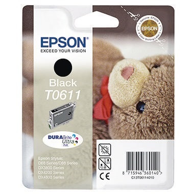 Epson Original Tintenpatronen sind optimal auf Ihren Drucker abgestimmt. Sie garantieren hohe Zuverlässigkeit, lange Haltbarkeit Ihrer Ausdrucke und problemloses Drucken über viele Jahre. · refill: Nein · max. Anzahl der Druckseiten: ca. 250 Seiten · Verwendung für Gerätetyp: Inkjetdrucker · Verwendung für Druckertyp: Stylus D 68PhotoEdition, -88, -88Plus, Stylus DX 3800, -3850 · Typbezeichnung der Verbrauchsmittelgruppe: T0611 · Originalzubehör: Ja · nachfüllbar: Nein · Inhalt: 8 ml · Garantie gewährt: Nein · Farbe: schwarz · Art der Technologie: DURABrite&trade, Ultra · dokumentenecht: Nein · DIN-Norm vorhanden: Nein · Ausführung der Farbe: schwarz · Typbezeichnung des Motivs: Bär · Kapazität geprüft gemäß: ISO/IEC 24711