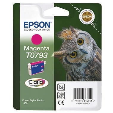 Epson Original Tintenpatronen sind optimal auf Ihren Drucker abgestimmt. Sie garantieren hohe Zuverlässigkeit, lange Haltbarkeit Ihrer Ausdrucke und problemloses Drucken über viele Jahre. · Farbe: magenta · Originalzubehör: Ja · refill: Nein · Typbezeichnung der Verbrauchsmittelgruppe: T0793 · Typbezeichnung des Motivs: Eule · Verwendung für Druckertyp: Stylus Photo 1400, -1500W, P 50, PX 650, -660, -700W, -710W, · nachfüllbar: Nein · Verwendung für Gerätetyp: Inkjetdrucker · Kapazität geprüft gemäß: ISO/IEC 24711 · Art der Technologie: Claria&trade, Photographic · Garantie gewährt: Nein · Inhalt: 11 ml · dokumentenecht: Nein · DIN-Norm vorhanden: Nein · Ausführung der Farbe: magenta · max. Anzahl der Druckseiten: ca. 685 Seiten