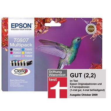 Epson Original Tintenpatronen sind optimal auf Ihren Drucker abgestimmt. Sie garantieren hohe Zuverlässigkeit, lange Haltbarkeit Ihrer Ausdrucke und problemloses Drucken über viele Jahre. · nachfüllbar: Nein · Verwendung für Gerätetyp: Inkjetdrucker · Originalzubehör: Ja · DIN-Norm vorhanden: Nein · refill: Nein · Typbezeichnung der Verbrauchsmittelgruppe: T0807 · Verwendung für Druckertyp: Stylus Photo R 265, -285, -360, RX 560, -585, -685, P 50, PX · max. Anzahl der Druckseiten: ca. 1 x 330 Seiten schwarz, ca. 5 x 435 Seiten farbig · Typbezeichnung des Motivs: Kolibri · Farbe: schwarz, cyan, magenta, gelb, fotocyan, fotomagenta · Inhalt: 6 x 7,4 ml · Garantie gewährt: Nein · dokumentenecht: Nein · Ausführung des Inhalts (Set): 6 St./Pack · Ausführung des Inhalts (Packung): 6 St./Pack. · Ausführung der Farbe: schwarz, mehrfarbig · Art der Technologie: Claria Photographic · Kapazität geprüft gemäß: ISO/IEC 24711