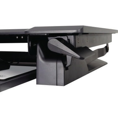 Dieser Tischaufsatz macht im Handumdrehen aus einem starren Tisch einen gesunden Steh-Sitz-Arbeitsplatz. Die Plattform wird direkt auf den Tisch gestellt, ist sofort einsatzbereit und äußerst stabil. Die Handgriffe links und rechs entriegeln und schon fährt der WorkFit Arbeitsplatz stufenlos senkrecht nach oben und rastet in jeder gewünschten Postition ein. Kein Montageaufwand, hochwertige Verarbeitung. · höhenverstellbar: Ja · Verwendung für Produkt: Monitore 76,2 cm (30") · Tischklemme vorhanden: Nein · Montageart bei Lieferung: komplett montiert · max. Tragfähigkeit: 18 kg · Maße Tastaturplatte: 69 x 28 cm (B x T) · Garantiedauer: 5 Jahre · Garantie gewährt: Ja · Farbe: schwarz · Abmessung der Arbeitsfläche: 95 x 64 cm (B x T) · max. Höhe: 38 cm