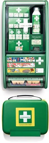 Inhalt gemäß DIN 13157 · bestehend aus Station, tragbarer Koffer (Inhalt gem. DIN 13157) und Wandhalterung · enthält Produkte für verschiedene Arten von Verletzungen · kann an unterschiedliche Bedürfnisse angepasst werden · Platz für Zusatzprodukte · klare, leicht verständliche Erste-Hilfe-Anleitungen sind auf der Station und auf den Produktverpackungen aufgedruckt · Weitere technische Eigenschaften Norm: DIN13157 + Erweiterungen