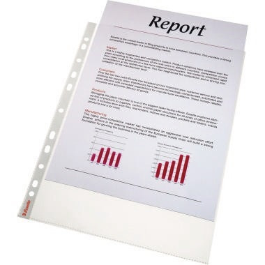 Für den täglichen Gebrauch. Zur Ablage in Ordnern und Ringbüchern. · dokumentenecht: Ja · Verwendung für Papierformat: DIN A4 · Papiereinlage vorhanden: Nein · Packungsmenge: 100 St./Pack. · Maße: 23 x 30,2 cm (B x H) · Werkstoff: Polypropylen · Lochrandverstärkung vorhanden: Ja · Dicke der Folie: 0,09 mm · Ausführung der Oberflächenbeschaffenheit: genarbt · Ausführung der Lochung: Universallochung · Anordnung der Lage (Öffnungsseite): oben offen · Hüllen strapazierfähig: Nein · Farbe: transparent