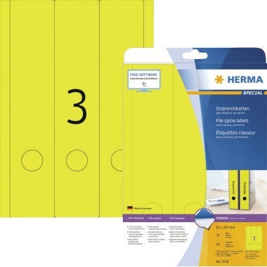 Für alle gängigen Ordner geeignet. Absolut blickdichtes Material mit hohem Weißgrad, alte Ordnerbeschriftungen scheinen nicht durch. Blanko: Ideal für Firmenlogo, Beschriftungen und Ordnungsvermerke. Sicher haftend, auch bei häufigem Ordnergebrauch. Etiketten sind 100 % recyclingfähig mit dem Altpapier, Verpackung aus Recyclingkarton. Kostenlose Softwarelösungen: http://www.herma.de/software. · Werkstoff: Papier · Format des Schildes: breit/lang · Verwendung für Druck- oder Schreibgerät: Laserdrucker, Farblaserdrucker, Inkjetdrucker, Kopierer · Verpackung: Packung · umlaufender Rand vorhanden: Nein · selbstklebend: Ja · Maße: 61 x 297 mm (B x H) · Klebemasse lösungsmittelfrei: Ja · Griffloch vorhanden: Ja · wieder ablösbar: Nein · Anzahl der Blätter je Packung: 20 Bl./Pack. · Farbe: gelb · blickdicht: Ja · Blauer Engel: Nein · Ausführung des Papiertyps: chlorfrei gebleicht · Ausführung des Etikettenträgers: A4-Blatt · Aufdruck vorhanden: Nein · Anzahl der Etiketten je Packung: 60 Etik./Pack. · Anzahl der Etiketten je Blatt: 3 Etik./Bl. · Forest Stewardship Council (FSC): Nein
