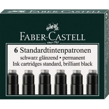 Faber-Castell Tintenpatrone Standard nicht löschbar schwarz 6 St./Pack. · Verwendung für Produkt: Füllfederhalter · Ausführung des Inhalts mit Packung: 6 St./Pack. · Farbe: schwarz · löschbar: Nein