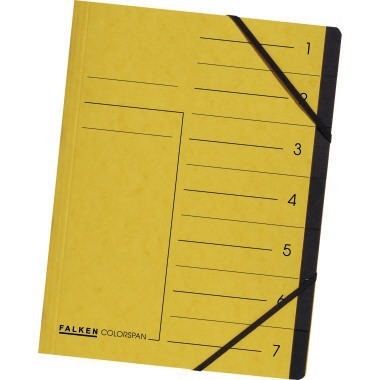 Zur Organisation von Unterlagen. · Forest Stewardship Council (FSC): Ja · Verwendung für Papierformat: DIN A4 · Organisationsaufdruck vorhanden: Ja · Material des Einbandes: Colorspankarton · Maße: 24 x 32 cm (B x H) · Grammatur: 355 g/m² · Farbe: gelb · Breite: 240 mm · Beschriftungsfeld vorhanden: Ja · Ausführung der Tabe: blanko · Art des Verschlusses: Gummizugverschluss · Anzahl der Fächer: 7 Fächer · Greifausschnitt vorhanden: Ja