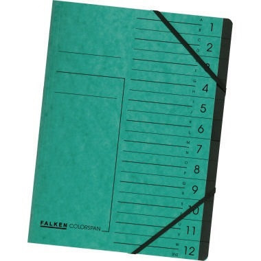 Zur Organisation von Unterlagen. · Grammatur: 355 g/m² · Beschriftungsfeld vorhanden: Ja · Organisationsaufdruck vorhanden: Ja · Material des Einbandes: Colorspankarton · Maße: 24 x 32 cm (B x H) · Greifausschnitt vorhanden: Ja · Verwendung für Papierformat: DIN A4 · Breite: 240 mm · Ausführung der Tabe: blanko · Art des Verschlusses: Gummizugverschluss · Anzahl der Fächer: 12 Fächer · Farbe: grün · Forest Stewardship Council (FSC): Ja
