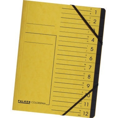 Zur Organisation von Unterlagen. · Organisationsaufdruck vorhanden: Ja · Verwendung für Papierformat: DIN A4 · Material des Einbandes: Colorspankarton · Maße: 24 x 32 cm (B x H) · Greifausschnitt vorhanden: Ja · Grammatur: 355 g/m² · Farbe: gelb · Breite: 240 mm · Beschriftungsfeld vorhanden: Ja · Ausführung der Tabe: blanko · Anzahl der Fächer: 12 Fächer · Art des Verschlusses: Gummizugverschluss · Forest Stewardship Council (FSC): Ja