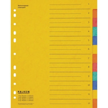 Auch für Prospekthüllen geeignet. · Verwendung für Papierformat: DIN A4, Überbreite · Werkstoff: Colorspankarton · Organisationsaufdruck vorhanden: Ja · Maße: 24 x 29,7 cm (B x H) · Lochrandverstärkung vorhanden: Nein · Grammatur: 265 g/m² · Forest Stewardship Council (FSC): Ja · Deckblatt vorhanden: Nein · Beschriftungsschild auswechselbar: Nein · Ausführung des Registers: volle Höhe · Ausführung der Tabe: blanko · Anzahl der Registerblätter: 12 Registerblätter · Ausführung der Lochung: Eurolochung · Farbe: farbig sortiert