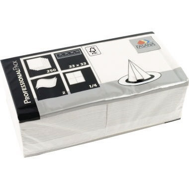 FASANA Serviette 33 x 33 cm (B x L) weiß 250 St./Pack. · Typbezeichnung der Papierqualität: Tissue · Maße: 33 x 33 cm (B x L) · freier Inhalt: 250 St./Pack. · Farbe: weiß · Anzahl der Lagen: 2-lagig · Ausführung der Falzung: 1/4-Falz