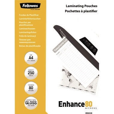 Fellowes® Laminierfolie Enhance 80 224 x 300 mm (B x H) DIN A4 80µm glänzend 250 St./Pack. · Maße: 224 x 300 mm (B x H) · Farbe: transparent · selbstklebend: Nein · Werkstoff: Polyester · Höhe: 300 mm · Breite: 224 mm · Ausführung des Inhalts (Packung): 250 St./Pack. · Ausführung der Oberflächenbeschaffenheit: glänzend · Abheftlochung vorhanden: Nein · abgerundete Ecken vorhanden: Nein · Verwendung für Papierformat: DIN A4 · Dicke der Folie: 80 µm