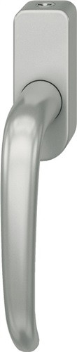 abschließbar · nach DIN EN 13126-3 · Design als Säbelform, wie von Max Bill für die Ulmer Hochschule gestaltet · 4-Punkt-Kugelrastung zur sauberen spürbaren und hörbaren Positionierung des Fenstergriffs in 90 Grad Schritten · dauerhafter Gleichlauf · Befestigung unsichtbar · Verschraubung M5, Entfernung der Befestigungspunkte 43 mm · Rosettenmaße ca. Höhe 84,5 x Breite 32,5 mm · Rosettenstärke ca. 21 mm · 7 mm Vollstift · gleichschließend 2 W 1 · Weitere technische Eigenschaften Grifflänge: 123mm • Nocken-Ø: 10mm • Lochabstand: 43mm • Sockelstärke: 21mm • Anschlagrichtung: DIN links / rechts • Prüfung: RAL-GZ 607/9