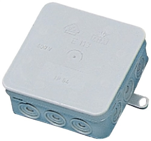 für die Aufputzinstallation · mit 12 selbstdichtenden Abschneid-Einführungen · spritzwassergeschützt · Schutzart IP54 · zwei Befestigungslaschen · mit Quer- und Langloch · Deckel montiert · großer Klemmraum