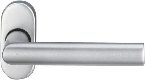 für Feuerschutzrahmentüren · gerade · fest-drehbar auf ovaler Rosette · mit Hochhaltefeder · Rosette Stärke 14,5 mm · Höhe 75 mm · Breite 34 mm · verdeckte Verschraubung · Lieferung ohne Stift und Schrauben · Weitere technische Eigenschaften Drückerlänge: 130mm • Typ: Profiltür • Befestigungsart: verdeckte Verschraubung • Drückertiefe: 65mm • Form: oval • Anschlagrichtung: DIN links / rechts • Farb-Nr.: EST • Norm: DIN 1906 • Lagerung: fest-drehbar