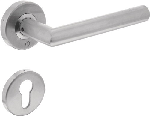 L-Form mit Gehrung · Feuerschutz nach FH DIN 18273 · fest/drehbar gelagert · Stift 9 mm · für Türstärke 38-42 mm · Stahlunterkonstruktion mit Stütznocken · Lochung PZ · Edelstahl matt · Drücker-ø 19 mm · Drückerlänge 153 mm · DIN links / rechts verwendbar · Drückergarnitur · Weitere technische Eigenschaften Ergänzung: D/D • Lagerung: fest-drehbar-gelagert • Vierkant: 9mm