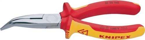 VDE-isoliert, bis 1000 V · mit Schneide · Vanadin-Elektrostahl · mit um 40° gewinkelten flach-runden Backen · gefertigt gem. IEC 60900/DIN EN 60900, stückgeprüft bei 10000 V im Wasserbad · Greifflächen gezahnt · Schneiden zusätzlich induktiv gehärtet · Schneidenhärte ca. 61 HRC · ölgehärtet · verwindungstolerante, elastische Präzisionsspitze Zange verchromt · Weitere technische Eigenschaften Spitzenstärke: 2,5mm • Backenausführung: flachrund, lang spitz • Backenlänge: 73mm • Material: Vanadin-Elektrostahl • Spitzenbreite: 3mm