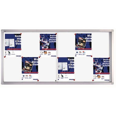 Lackierte Schreibtafeloberfläche, trocken abwischbar und beschriftbar. · Material des Rahmens: Aluminium · Verwendung für Papierformat: 12 x DIN A4 · Zubehör für die Wandbefestigung: Befestigungsmaterial · Verpackung: Karton · Typbezeichnung der Glasart: Einscheiben-Sicherheitsglas · Schloss vorhanden: Ja · magnethaftend: Ja · Farbe: weiß · Farbe des Rahmens: silbereloxiert · Einsatzbereich: Innenbereich · Anzahl der Schlüssel: 2 Schlüssel · Ausführung der Tür: Schiebetüren · Maße: 139 x 68 x 4,6 cm (B x H x T)