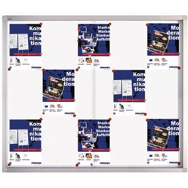 Lackierte Schreibtafeloberfläche, trocken abwischbar und beschriftbar. · magnethaftend: Ja · Verwendung für Papierformat: 15 x DIN A4 · Verpackung: Karton · Typbezeichnung der Glasart: Einscheiben-Sicherheitsglas · Schloss vorhanden: Ja · Maße: 117,5 x 99 x 4,6 cm (B x H x T) · Zubehör für die Wandbefestigung: Befestigungsmaterial · Farbe: weiß · Farbe des Rahmens: silbereloxiert · Einsatzbereich: Innenbereich · Ausführung der Tür: Schiebetüren · Anzahl der Schlüssel: 2 Schlüssel · Material des Rahmens: Aluminium