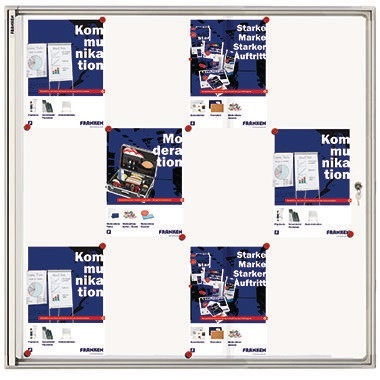 Elegantes Design mit sehr robustem, silbereloxiertem Aluminiumrahmen mit grauen Kunststoffecken. · magnethaftend: Ja · Zubehör für die Wandbefestigung: Befestigungsmaterial · Verwendung für Papierformat: 12 x DIN A4 · Verpackung: Karton · Typbezeichnung der Glasart: Acrylglas · Schloss vorhanden: Ja · Maße: 96 x 98 x 3,5 cm (B x H x T) · Farbe: weiß · Farbe des Rahmens: silbereloxiert · Einsatzbereich: Innenbereich · Ausführung der Tür: Flügeltüren · Anzahl der Schlüssel: 2 Schlüssel · Material des Rahmens: Aluminium/Kunststoff
