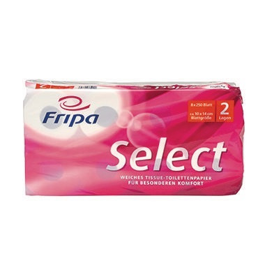 Fripa Toilettenpapier Select 2-lagig 100 % Zellstoff hochweiß 250 Bl./Rl. 8 Rl./Pack. · Material des Toilettenpapiers: Zellstoff · Anzahl der Blätter: 250 Bl./Rl. · Anzahl der Lagen: 2-lagig · Ausführung des Inhalts (Packung): 8 Rl./Pack. · Farbe: hochweiß · Maße: 10 x 14 cm (B x H)
