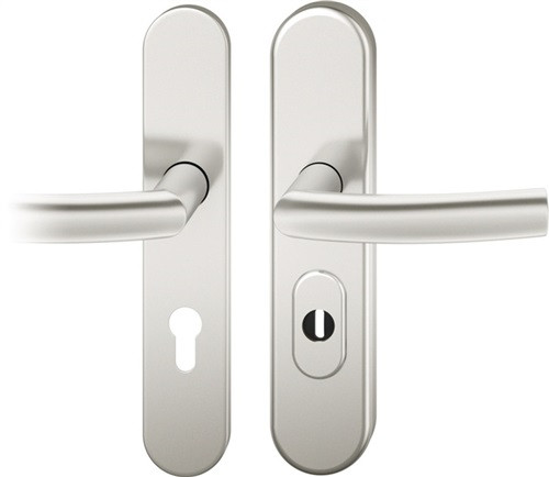 Langschild-Garnitur · für Außentüren · geprüft nach DIN 18257 und 18273 · außen gekröpfter runder Flachknopf · innen Türgriff fest/drehbar gelagert · Drückerausführung FSB 1107 · verdeckte, durchgehende Befestigung · Lochung PZ, mit Zylinderabdeckung · Entfernung 72 mm · Vierkant 9 mm · Türstärke 67-69 mm · DIN links / rechts verwendbar · Weitere technische Eigenschaften Ergänzung: D/D • Widerstandsklasse: ES 1 • Zylinderabdeckung: mit ZA • Norm: DIN 18273 • Lagerung: fest-drehbar-gelagert • Vierkant: 9mm