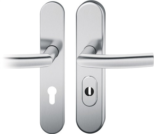 Langschild-Garnitur · für Außentüren · geprüft nach DIN 18257 und 18273 · außen gekröpfter runder Flachknopf · innen Türgriff fest/drehbar gelagert · Drückerausführung FSB 1107 · verdeckte, durchgehende Befestigung · Lochung PZ, mit Zylinderabdeckung · Entfernung 72 mm · Vierkant 9 mm · Türstärke 67-69 mm · DIN links / rechts verwendbar · Weitere technische Eigenschaften Ergänzung: D/D • Widerstandsklasse: ES 1 • Zylinderabdeckung: mit ZA • Norm: DIN 18273 • Lagerung: fest-drehbar-gelagert • Vierkant: 9mm